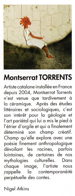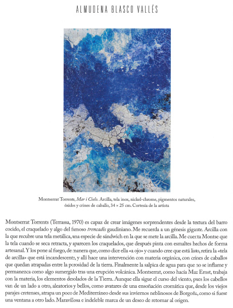 « Montserrat, à l’instar de Max Ernst, travaille la matière, les éléments désolés de la terre. Elle suit le cours du vent, car ses cheveux ondulent au gré du vent, d’une beauté aléatoire, tels des avatars d’une rêverie chromatique qui, puisant dans les paysages antiques de la Crète, capte un fragment de Méditerranée et de ses hivers brumeux de Bourgogne, comme une fenêtre ouverte sur un autre monde. Une marque merveilleuse et indélébile d’un désir de retour aux sources. »