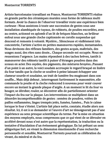 « Par la mise en situation des moyens employés, nous comprenons que ce qui vient de se dérouler en accéléré devant nous n’est autre que la représentation, la traduction ou la tentative d’élucidation d’un événement géologique. En lui prêtant un sens allégorique fort, en vivant la dimension émotionnelle d’une recherche personnelle et sensible, Montserrat Torrents poursuit sa célébration du vivant, du minéral et du feu. »